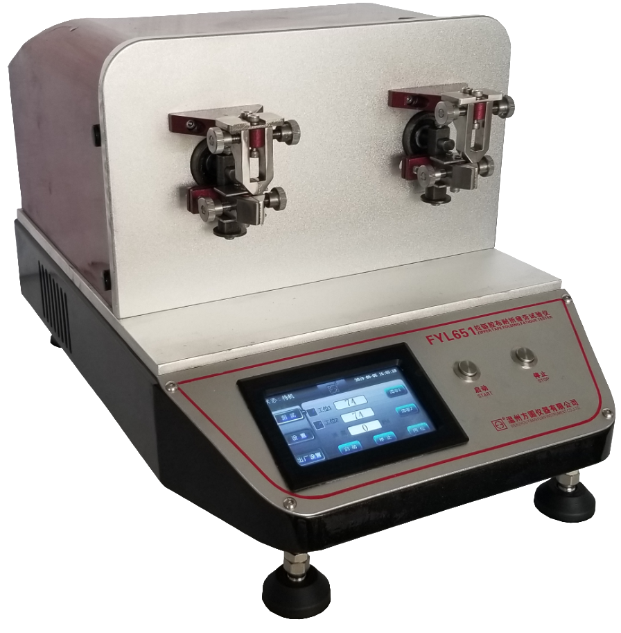 FYL651拉鏈膠布耐折疲勞試驗儀配有2工位,可分別通過上夾具固定拉鏈膠布一端,同時根據(jù)拉鏈型號調(diào)整下夾具的初始位置后將另一端用下夾具固定鎖好,并通過設(shè)定不同的測試速率以及調(diào)整不同的測試角度(機械調(diào)整)使下夾具圍繞上夾具頂點為圓心做反復運動,模擬拉鏈膠布在日常使用過程中的狀態(tài),檢測拉鏈膠布的耐折疲勞性能。