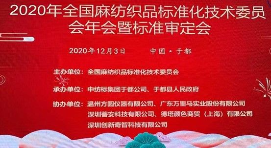 2020123, 全國麻紡織品標(biāo)準化技術(shù)委員會第四屆第四次委員代表大會在江西·于都順利召開。本屆大會由全國麻紡織品標(biāo)準化技術(shù)委員會主辦,中紡標(biāo)集團于都公司、于都縣人民政府承辦,溫州方圓儀器有限公司、廣東萬里馬實業(yè)股份有限公司、深圳菩安科技有限公司、德塔顏色商貿(mào)(上海)有限公司、深圳創(chuàng)新奇智科技有限公司協(xié)辦。
